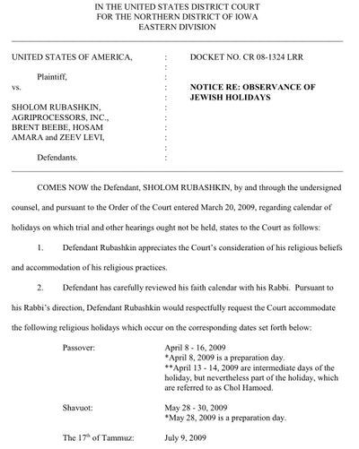 Below: Rubashkin's request for the court to be in recess on Jewish holidays: