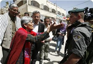 Local sources said that the IOF soldiers tried to prevent the couple, who were accompanied by Palestinian MP Mustafa Al-Barghouthi, from reaching the settlement outposts erected in the vicinity of the Ibrahimi Mosque and detained a number of journalists who were covering the visit.