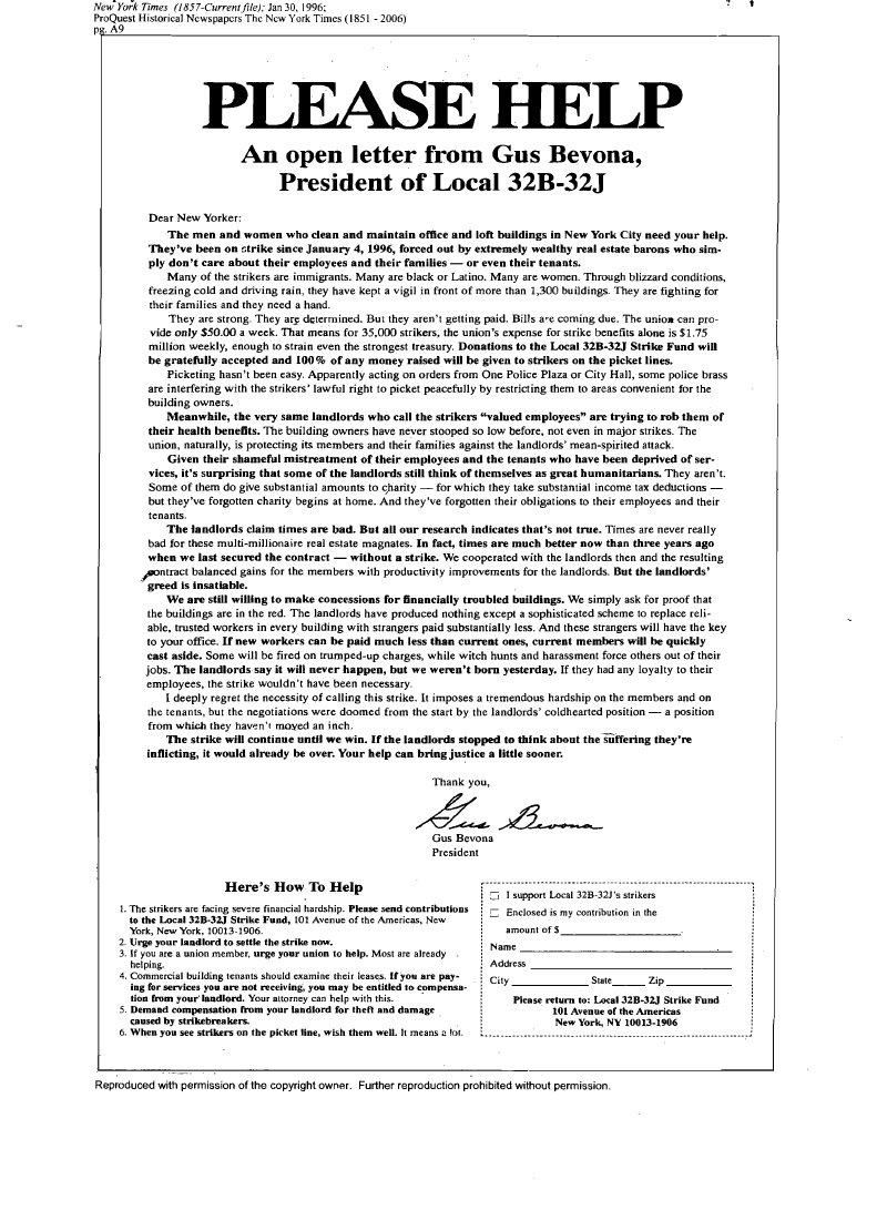 The above flyer (full text here) was distributed during the 1996 NYC janitors' strike. In the flyer, union leader Gus Bevona warned tenants of buildings "owned by extremely wealthy real estate barons" of the owners' scheme to replace trusted workers with "strangers paid substantially less" who "will have the key to your office." The flyer states that the building owners were making false claims about the properties being "financially troubled" in order to replace higher paid union workers with non-union labor.