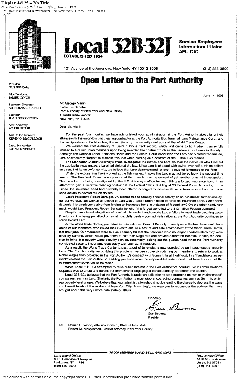 According to the above flyer (full text here), in 1996 the Port Authority of NY hired dicey non-union contractor Laro Maintenance Corp. to clean the Port Authority Bus Terminal, and let in poverty wage, non-union Summit Security to provide security services to the World Trade Center. As a result, long time union security guards at the WTC were told their services were no longer needed as of February 29, 1996. Bevona was ousted from 32BJ in February 1999, within a month of the end of contracts for over 30,000 maintenance, cleaning, security, and other workers in NYC office buildings, including the WTC. Soon other contractors with non-union labor at lower wages moved in to service the buildings.