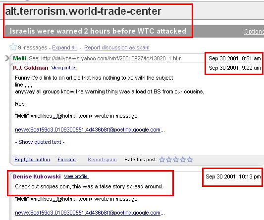 Above - Posts from Google Groups circa 2001, back then known as Usenet, on the Odigo 9-11 warnings to Israelis. These Usenet posts are dated starting September 30, 2001 (click on image to enlarge). The third one down reads "Check out snopes.com this was a false story spread around". Less than 3 weeks after 9-11, Snopes.com already "knew" and was broadcasting that the Odigo messaging incident was an "urban legend". (Link to posts here - if that dissapears, the page capture is here). The people who run Snopes, Barbara and David Mikkelson, are not journalists or research librarians. They met on a newsgroup, alt.folklore.urban.